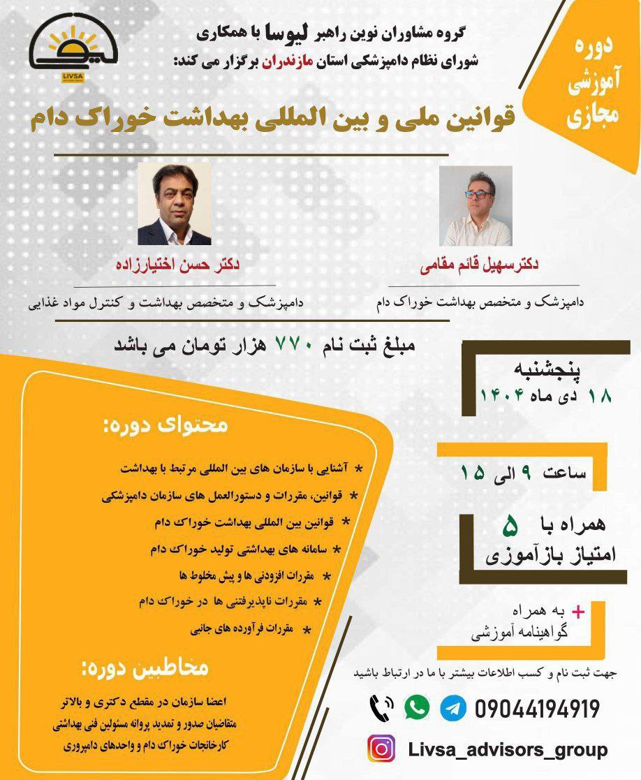 🔴🔴دوره آموزشی مجازی قوانین ملی و بین المللی بهداشت خوراک دام