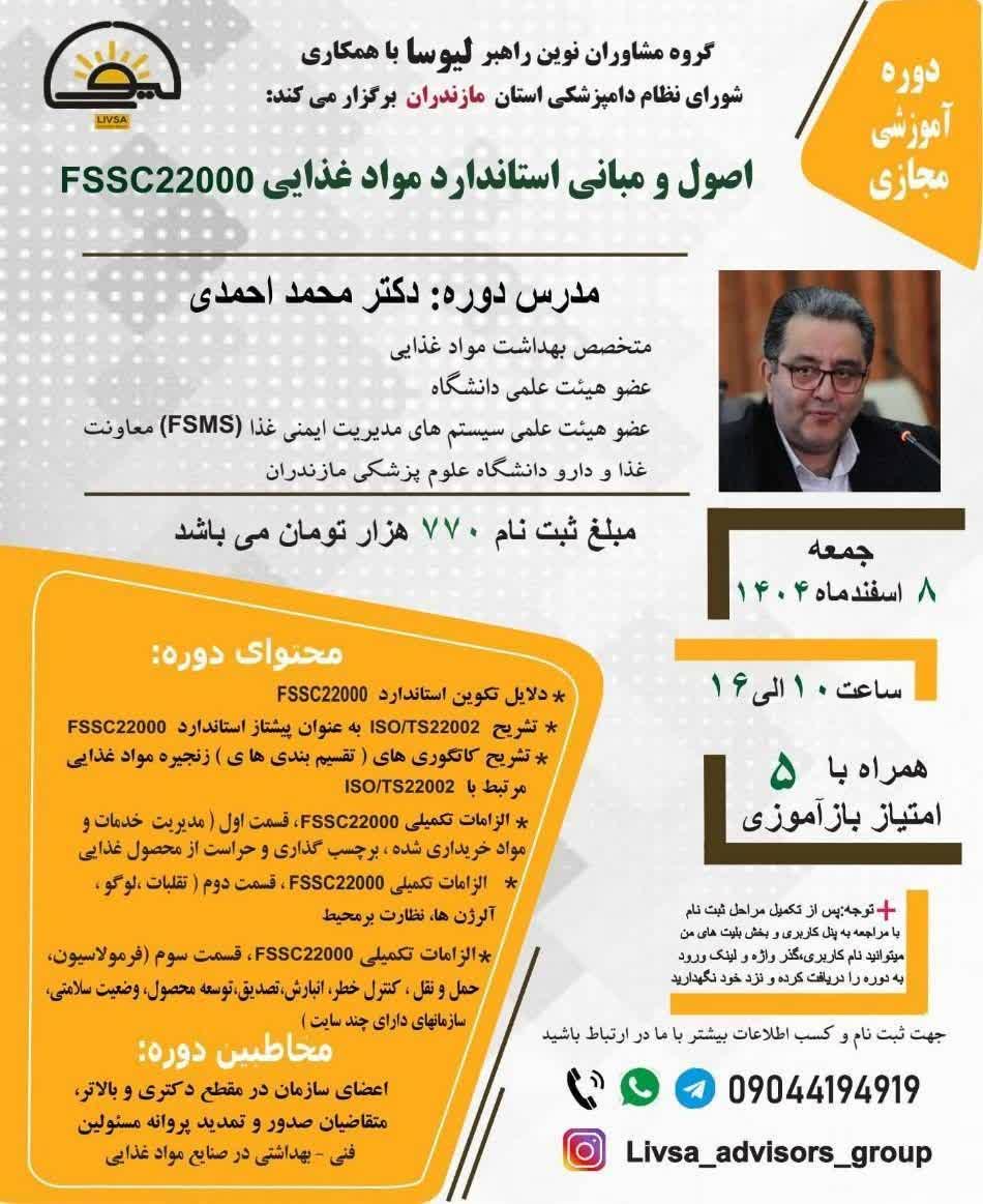 🔴🔴 اطلاعیه تاریخ جدید برگزاری دوره آموزشی مجازی اصول و مبانی استاندارد موادغذایی FSSC22000