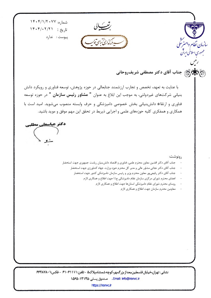 روابط عمومی سازمان، ضمن تبریک این انتصاب شایسته، حضور دکتر شریفروحانی را در جایگاه مشاور رئیس سازمان، گامی مهم در مسیر توسعه تعاملات علمی، ارتقاء ظرفیتهای دانشبنیان در بخش خصوصی دامپزشکی و تقویت ارتباط حرفه با حوزههای نوآوری و فناوری میداند.