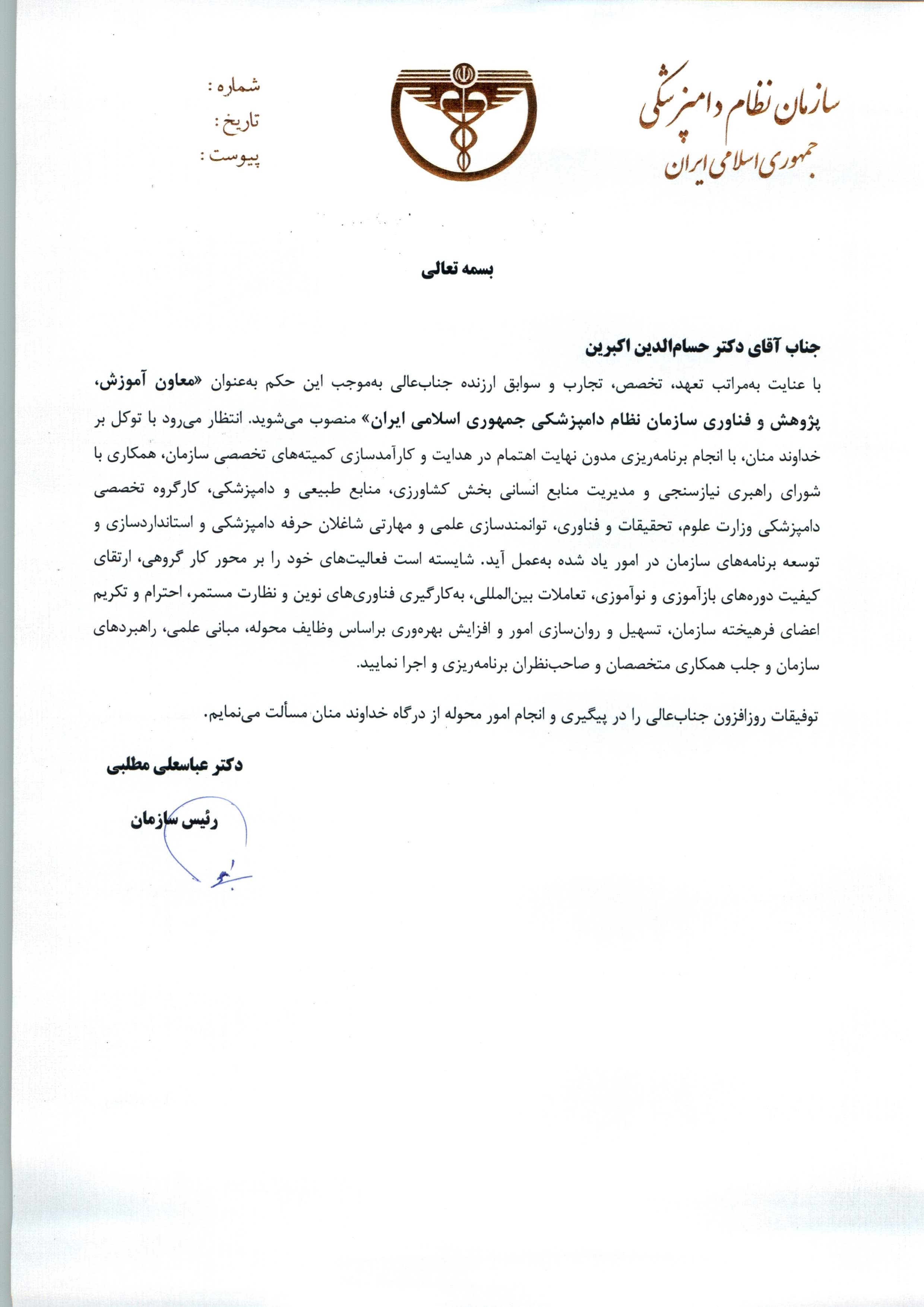 به گزارش روابط عمومی سازمان نظام دامپزشکی جمهوری اسلامی ایران، در جلسه شورای معاونین سازمان که با حضور «دکتر عباسعلی مطلبی» رئیس سازمان برگزار شد، «دکتر حسامالدین اکبرین» به عنوان معاون آموزش، پژوهش و فناوری منصوب و از خدمات «دکتر مهران مهدیپور» قدردانی شد.