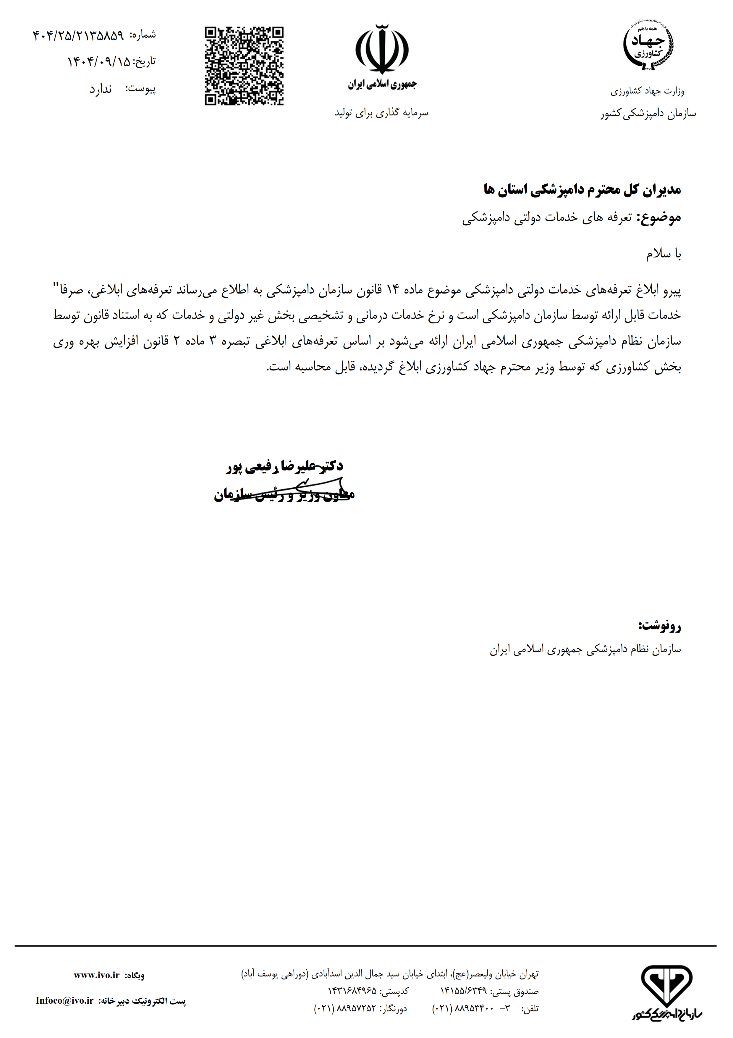 در راستای شفافسازی موضوع و رفع برخی برداشتهای نادرست، «دکتر علیرضا رفیعیپور»، رئیس محترم سازمان دامپزشکی کشور، طی نامهای رسمی خطاب به مدیران کل دامپزشکی استانها، تصریح نمودهاند که تعرفههای ابلاغی اخیر، منحصراً ناظر بر خدمات دولتی قابل ارائه توسط سازمان دامپزشکی کشور بوده و ارائه خدمات تشخیصی، درمانی و حرفهای در بخش غیردولتی، مطابق صریح قانون، در حیطه اختیارات سازمان نظام دامپزشکی جمهوری اسلامی ایران قرار دارد.