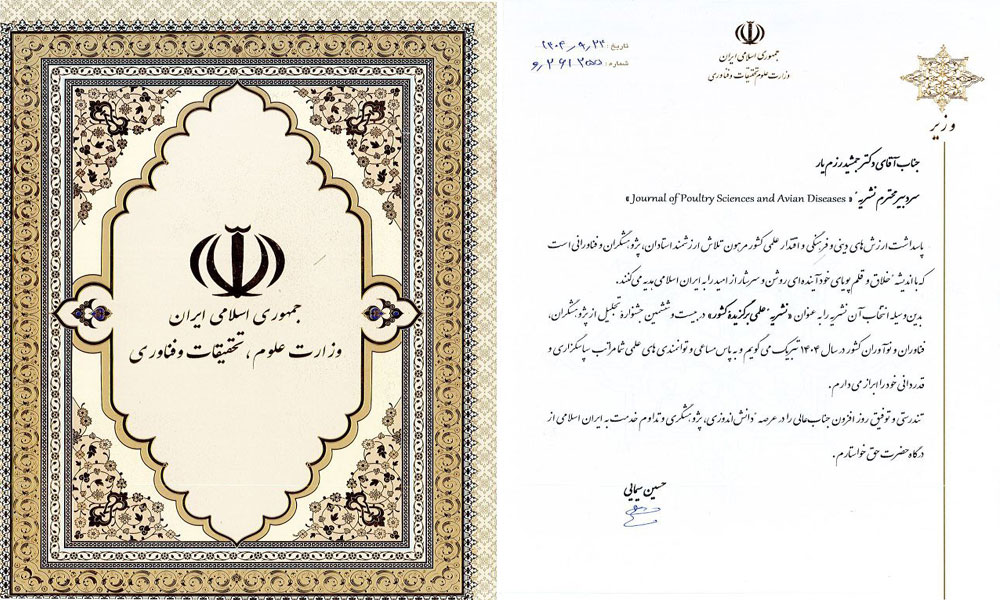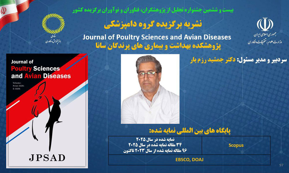 در کنار این دستاورد مهم، انتخاب نشریه علمی Journal of Poultry Sciences and Avian Diseases بهعنوان نشریه برگزیده گروه دامپزشکی در بیستوششمین جشنواره تجلیل از پژوهشگران، فناوران و نوآوران برگزیده کشور، افتخاری درخشان برای خانواده دامپزشکی ایران بهشمار میرود. این نشریه، بهعنوان نخستین نشریه انگلیسیِ اسکوپوسشده در بخش خصوصی دامپزشکی کشور، نقش بسزایی در ارتقای مرجعیت علمی، بینالمللیسازی پژوهشها و گسترش انتشار دانش تخصصی دامپزشکی ایفا کرده است. سردبیری و مدیرمسئولی این نشریه بر عهده «دکتر جمشید رزمیار» عضو هیأت علمی و دانشیار گروه بهداشت و بیماریهای پرندگان دانشکده دامپزشکی دانشگاه تهران است.